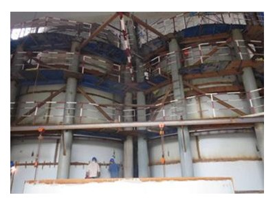 液压同步提升系统按照95%,90%,80%,70%,60%,50%,40%,30%,20%的依次分级卸载,直至钢绞线变成松弛状态,钢析架荷载全部转移至两端钢框柱上;
