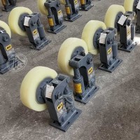 滚轮罐耳用于矿山提升容器的导向缓冲,本产品采用先进的密封技术,适应淋水、煤尘等恶劣环境。轮头安装采用三锁紧结构,避免掉轮头事故的发生。滚轮采用四氢呋喃-环氧丙烷共聚醚型聚氨酯浇注,具有高弹性、耐撕裂、抗水性、抗油性的优点。滚轮磨损补赏调节采用左、右旋螺杆,调节迅速便捷。机座、摆架采用钢板焊接成型,体积小、重量轻,安装轻便。技术性能靠谱