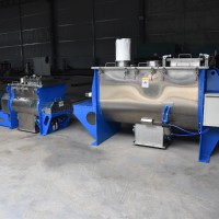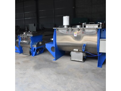 卧式螺带混合机可以有效率、快速的混合物料,在搅拌轴的螺旋带运动下使内外螺旋带在较大范围内翻动物料,内螺旋带将物料向内侧运动,外螺旋带将物料由两侧内向运动,使物料来回掺混,另部分物料被螺旋带推动下,沿轴向径向运动,从而形成对流循环,由于上述运动的搅拌,物料在较短时间内获得快速均匀混合。
