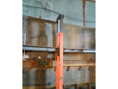 通常设备既可以布置在烟囱钢内筒内部也可布置在其外部。考虑到本工程烟囱钢内筒的筒壁板材设计为钦钢复合板,为了避免施工中损伤内壁钦板板面,所以将提升设备布置在钢内筒外部,即沿钢内筒外筒壁周长一圈均匀布置8个的钢支撑(型钢立彬,每个钢支撑顶面各安装液压千斤顶1个,每个千斤顶竖向插入1根提升钢爬杆,钢爬杆底部连接环形抱箍(钢圈梁)和双螺母。