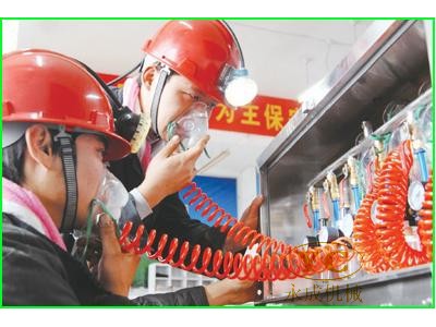 本装置内装六个呼吸面罩联成一组,装在不锈钢的箱体内,组成一个井下自救系统,并由地面泵房供气。