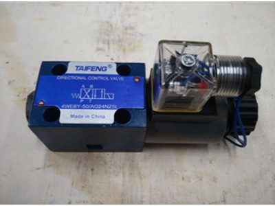 山东泰丰智能控制股份有限公司(原山东泰丰液压股份有限公司)生产的4we6型电磁换向阀是用电磁铁直接推动阀芯移位工作的小型方向控制阀,主要用于控制液体的通断和流动方向,也可以作为先导控制阀,以控制各种大通径的液压阀(电液换向阀或二通插装阀),实现对大功率液压阀的先导控制。其特点是:1.以直动式电磁铁操作方向滑阀作为标准类型;2.安装面符合DIN24340A型ISO4401和CETOP-RP121H;3.带可拆卸线圈的湿式直流获交流电磁铁;4.电磁铁可旋转90度;5.可以迅速而方便的更换电磁铁线圈而不引起液压系统漏油;6.可选的手动应急操作