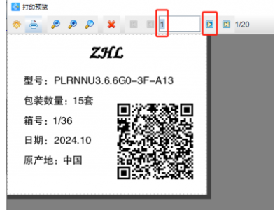 3.制作完成之后,点击软件顶部的“打印”按钮,在打开的窗口中设置数据量为20,开始页码为1,点击结束页码后面的“尾页”,然后点击下面的“浏览”按钮,翻页查看批量生成的外箱标签,预览无误就可以直接连接打印机打印出来了。