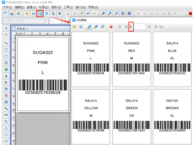 6. 点击软件顶部的“打印预览”按钮,翻页查看批量生成的带交叉25码的标签,预览无误就可以直接连接打印机打印出来或者批量输出PDF文档、TIF文档、图片等。
