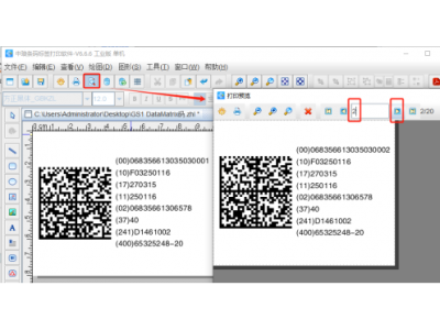 4. 排版设置好后,点击软件顶部的“打印预览”按钮,翻页查看批量生成的GS1 DataMatrix码,我们可以看到二维码右侧可读数据和二维码中数据是一一对应的。预览无误就可以直接连接打印机打印出来或者批量输出PDF文档、图片、TIF文档了。