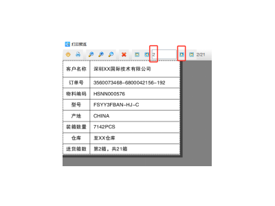 5. 点击软件顶部的“打印”按钮,在打开的窗口中设置数据量为21,开始页码为1,点击结束页码后面的“尾页”,然后点击下面的“预览”按钮,翻页查看批量生成的送货标签,预览无误就可以直接连接打印机批量出来了。
