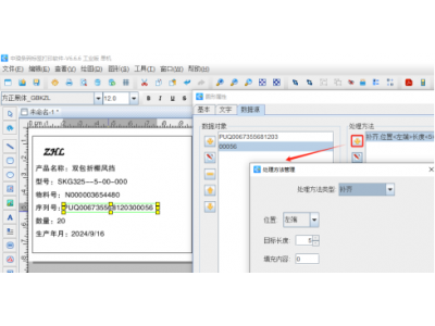 点击数据对象下面的“添加”按钮,在打开的窗口中选择“序列生成”数据类型,开始字符串设置为56,然后点击右侧处理方法下面的“添加”按钮,添加一个“补齐”数据处理方法,将左侧的流水号补齐5位数字。