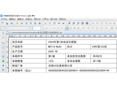 外包装箱在产品运输、储存和销售过程中是不可缺少的,其上的标签往往承载着重要的产品信息,如项目名称、产品型号、批次、生产日期、箱号、总箱数、箱内数、制造厂家、箱内产品编号等。下面我们来看看包含有这些产品信息的电流互感器外包装箱标签在中琅条码打印软件中是如何制作的。