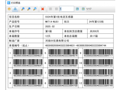 6. 设置完成之后,点击软件顶部的“打印”按钮,在打开的窗口中我们可以看到数据量自动显示的17,开始页码为1,结束页码为17,然后点击下面的“预览”按钮,翻页查看批量生成的电流互感器外包装箱标签,预览无误就可以直接连接打印机打印出来了。