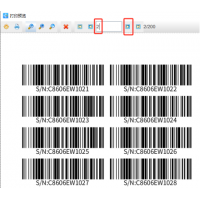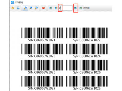 5. 制作完成之后,点击软件顶部的“打印”按钮,在打开的窗口中设置数据量(标签的总个数)为200、开始页码为1,点击结束页码后面的尾页,然后点击下面的“预览”按钮,翻页查看批量生成的流水SN条码,预览无误就可以直接连接打印机打印出来或者批量输出PDF文档了。